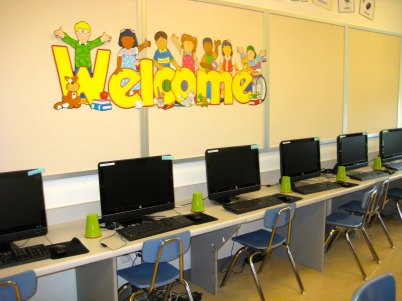 To add more color to the walls, I also created a technology alphabet which I posted around the room (e.g., A for Audacity, B for Browser). Then I checked all of my equipment and tested out the TVs to make sure everything was set up for the first class. Finally, I created the content for my bulletin boards, making sure to add more color and lots of visuals for my younger learners who cannot read yet.